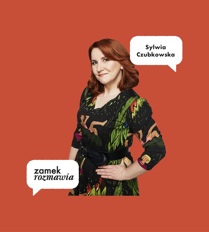 Obok niej dwa dymki-komentarze. Jeden z tekstem: zamek rozmawia, a drugi z nazwiskiem: Sylwia Czubkowska.