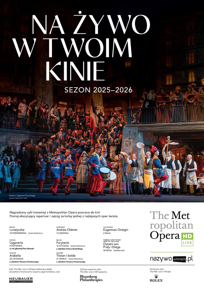 Metropolitan Opera ogłosiła szczegóły swojego sezonu 2025–26, w tym repertuar transmisji The Met: Live in HD, tym samym zapowiadając osiemnasty sezon transmisji operowych z Met w Polsce. Przed nami prawdziwe święto dla miłośników opery. Od jesieni 2025 do późnej wiosny 2026 nowojorska scena zaprezentuje w ramach cyklu Live in HD osiem wyjątkowych tytułów – zarówno uwielbianych arcydzieł, jak i ekscytujących, nowych inscenizacji. Widzowie będą mieli okazję podziwiać gwiazdy światowej opery, a także pracę uznanych reżyserów, dyrygentów oraz twórców scenografii i kostiumów.
