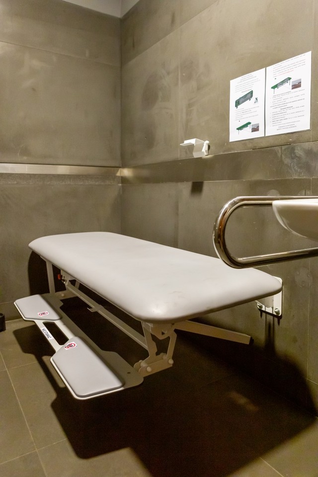 Zdjęcie przedstawia pomieszczenie z przewijakiem ściennym dla osób z niepełnosprawnościami. Przewijak jest rozkładany i zamocowany do ściany, posiada metalową konstrukcję oraz miękką, wodoodporną powierzchnię. Pod przewijakiem znajduje się podnóżek z antypoślizgową powierzchnią. Ściany pomieszczenia są wyłożone ciemnymi płytkami, a na jednej z nich zamocowano instrukcję obsługi przewijaka. W prawym dolnym rogu zdjęcia widoczna jest część umywalki i poręczy ułatwiającej korzystanie z wyposażenia.