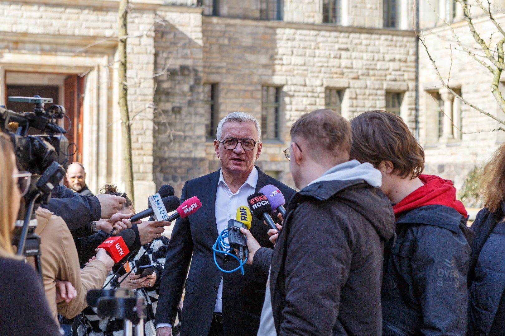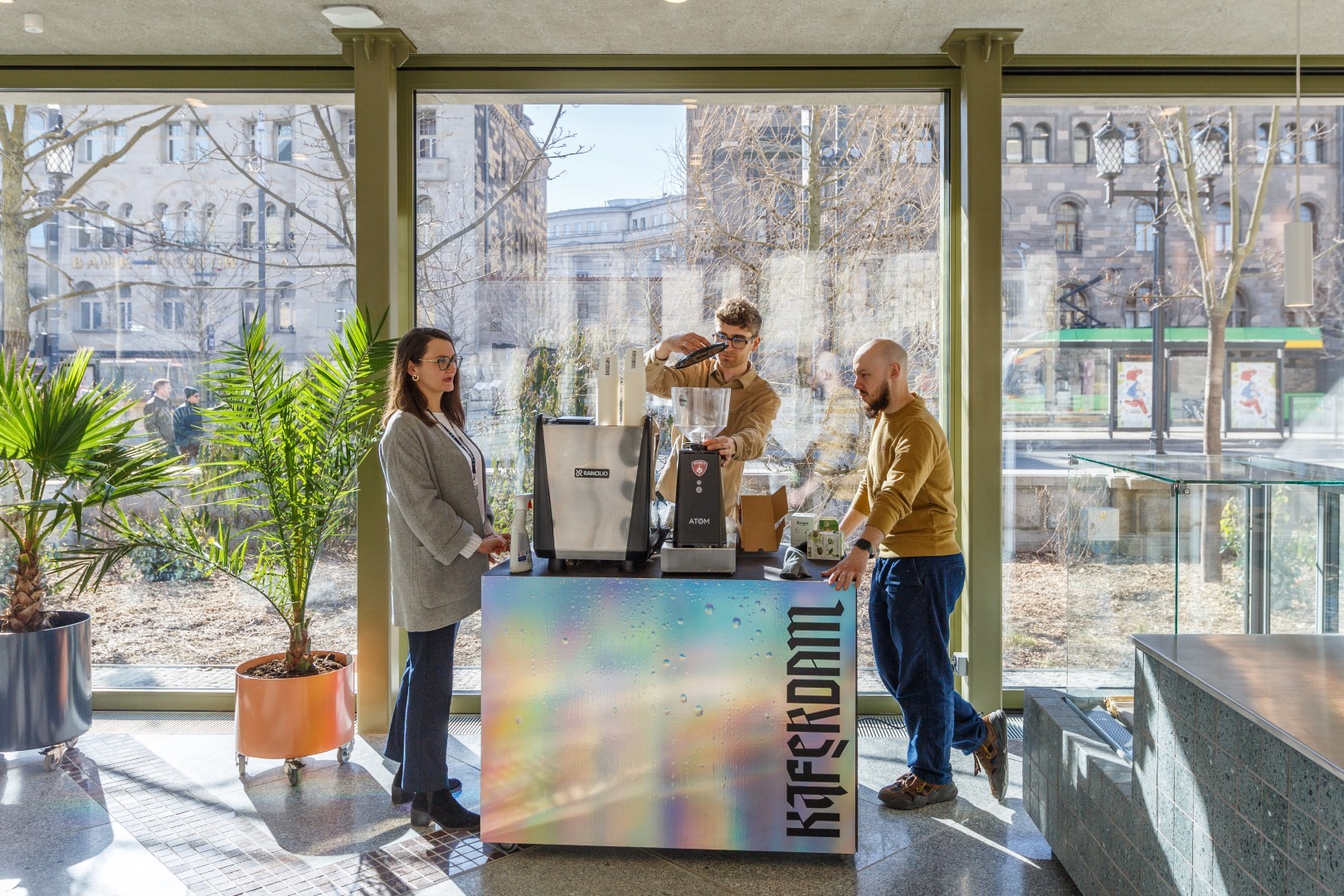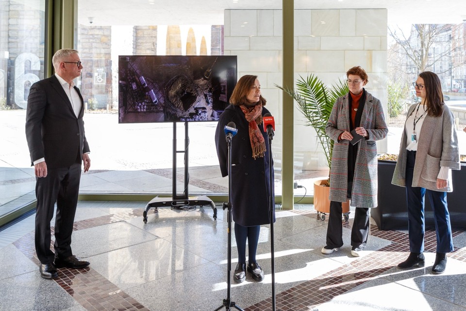Galeria zdjęć z konferencji prasowej. Słoneczny pogodny dzień. Na rozległym dziedzińcu zbiera się duża grupa osób. Mają na sobie ciepłe ubrania. Dziennikarze i dziennikarki zadają pytania Prezydentowi Miasta Poznania Jackowi Jaśkowiakowi, dyrektorkom Centrum Kultury ZAMEK, Annie Hryniewieckiej i Zofii Starikiewicz oraz Marii Fenrych, pracowniczki Działu Projektów Interdyscyplinarnych. Wewnątrz pawilonu na Dziedzińcu właściciele kawiarni robią kawę.