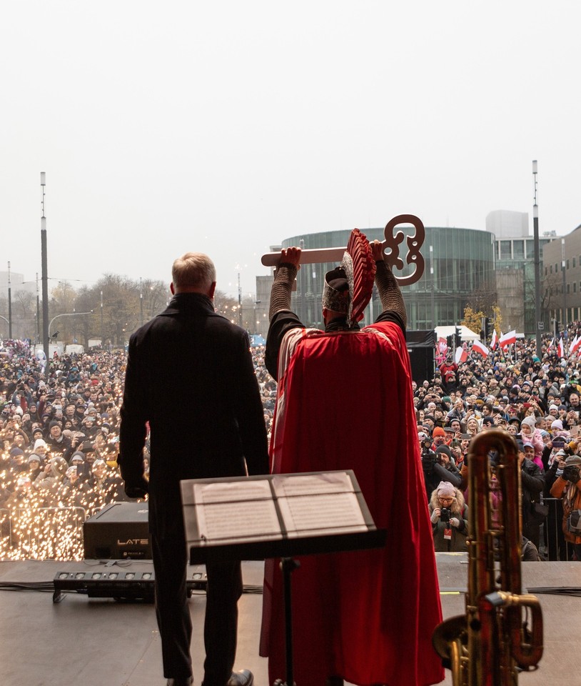 Zdjęcie przedstawia moment wręczenia kluczy do miasta świętemu Marcinowi. Prezydent i święty Marcin stoją tyłem do obiektywu fotografa. Przed nimi rozciąga się tłum. Święty Marcin podnosi do góry wielki srebrny klucz, jest ubrany w czerwony płaszcz i hełm z grzebieniem.