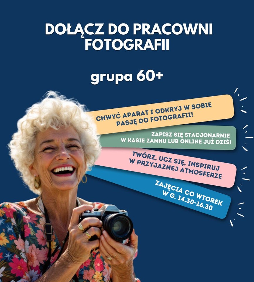 Na grafice widać starszą kobietę, która szeroko się uśmiecha i trzyma w rękach aparat fotograficzny. Grafika ma granatowe kontrastowe tło i biały napis: dołącz do pracowni fotografii grupa 60+, a także inne hasła zachęcające do zapisania się do grupy na kolorowych paskach.