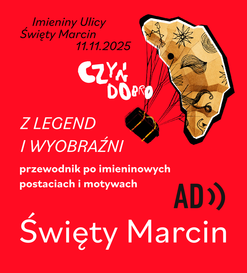 Dziś możesz spotkać się ze Świętym Marcinem na ulicy, która go upamiętnia. Odbierze on klucze do miasta. Szukaj jego czerwonego płaszcza wśród barwnego Imieninowego Miasteczka. W przestrzeni widoczna będzie też instalacja, która nawiąże do żołnierskiego punktu w życiorysie świętego – Wielka Głowa Legionisty – Świętego Marcina. Podczas Imienin Ulicy Święty Marcin każda osoba będzie mogła przebrać się w jego szaty. Kto wie? Może dzięki temu poczujecie potrzebę czynienia dobra?