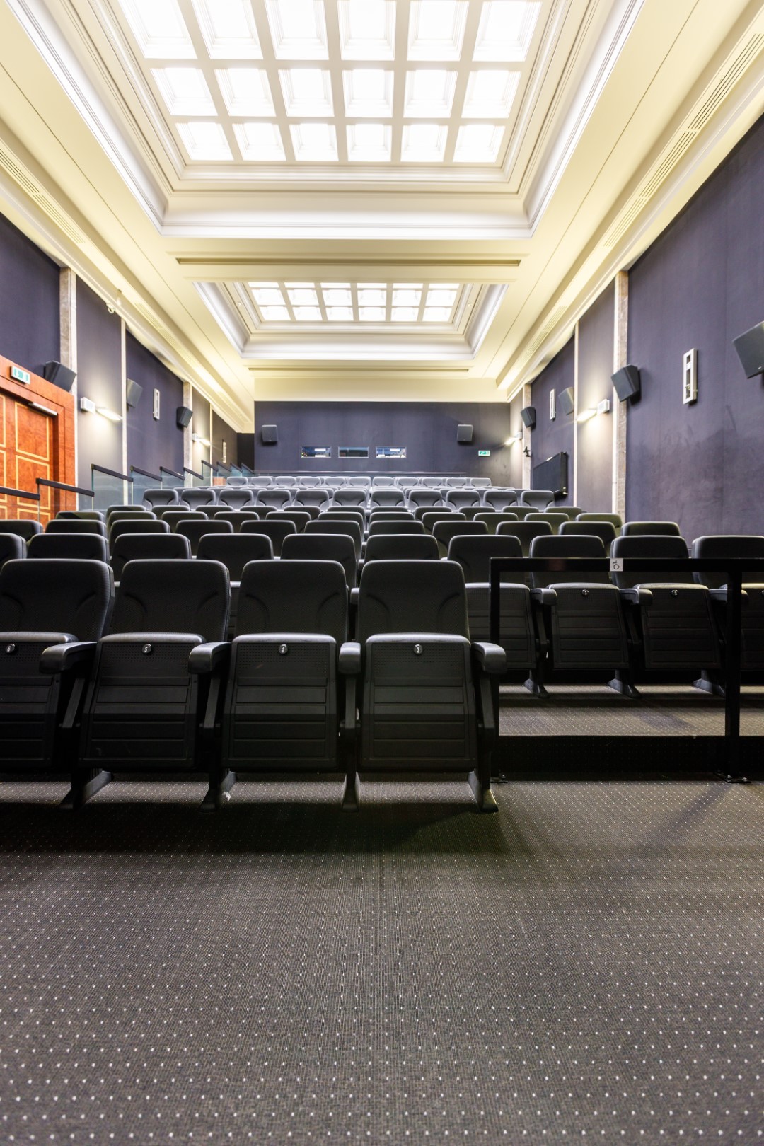Zdjęcie Sali Kinowej. Przed nami rząd foteli, a w tle duży, biały ekran kinowy, na którym wyświetlamy filmy. Sufit jest biały i ozdobiony sztukateriami.