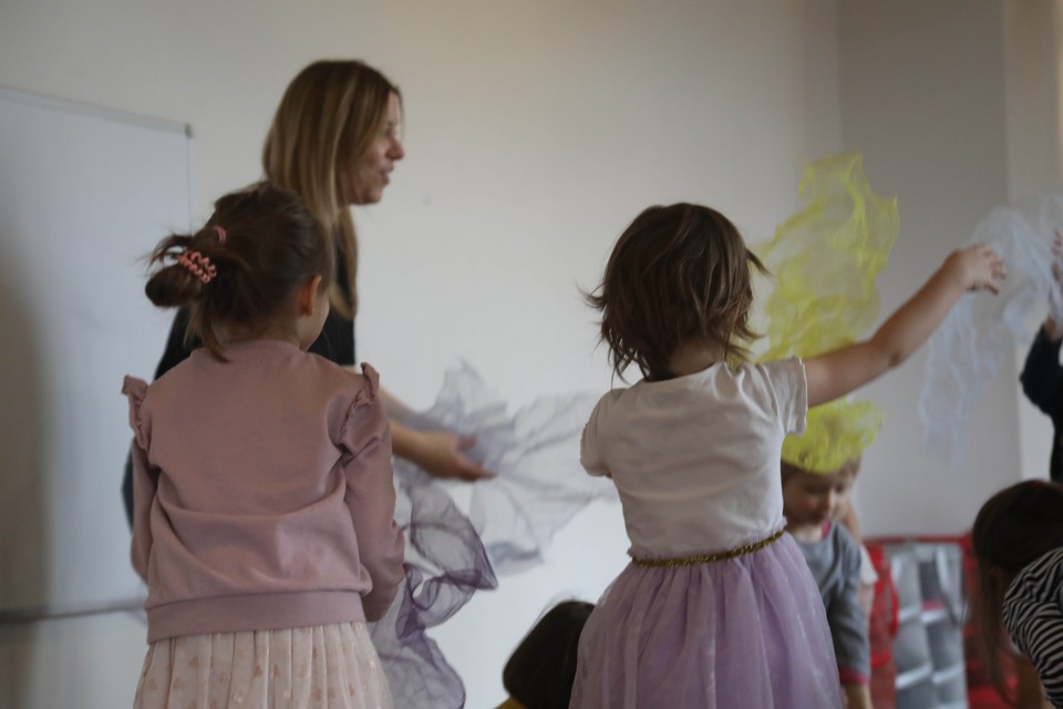Na zdjęciu widać grupę dzieci bawiących się kolorowymi, lekkimi chustkami w jasnej sali – Bawialni. Z tyłu stoi prowadząca, która również trzyma chustkę i kieruje zajęciami.