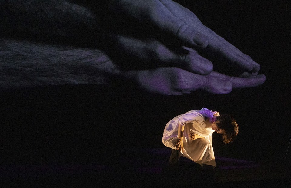 Zdjęcie zorientowanie poziomo. Osoba w ciemnych włosach, ubrana w jasną suknię, wykonuje ekspresyjny taniec na ciemnej scenie. Nad nią, na tle, wyświetlony jest duży obraz zbliżenia splecionych dłoni, oświetlonych fioletowym światłem.