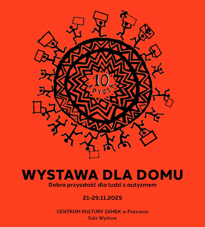 Plakat w intensywnym pomarańczowym kolorze z dużą, czarną, ozdobną mandalą pośrodku, której zewnętrzną część tworzą sylwetki osób trzymających prostokątne tabliczki. W centrum mandali widnieje napis „10 edycja”. Pod grafiką znajdują się informacje o wydarzeniu: „Wystawa dla domu. Dobra przyszłość dla ludzi z autyzmem. 21–29.11.2025. Centrum Kultury Zamek w Poznaniu, Sala Wystaw.”