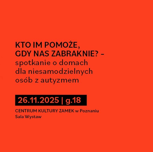 Pomarańczowy plakat z czarnym tekstem informującym o wydarzeniu: „Kto im pomoże, gdy nas zabraknie? – spotkanie dla niesamodzielnych osób z autyzmem”. Poniżej w czarnym prostokącie widnieje data i godzina: „26.11.2025 | g. 18”. Na dole umieszczono miejsce wydarzenia: „Centrum Kultury Zamek w Poznaniu, Sala Wystaw”.