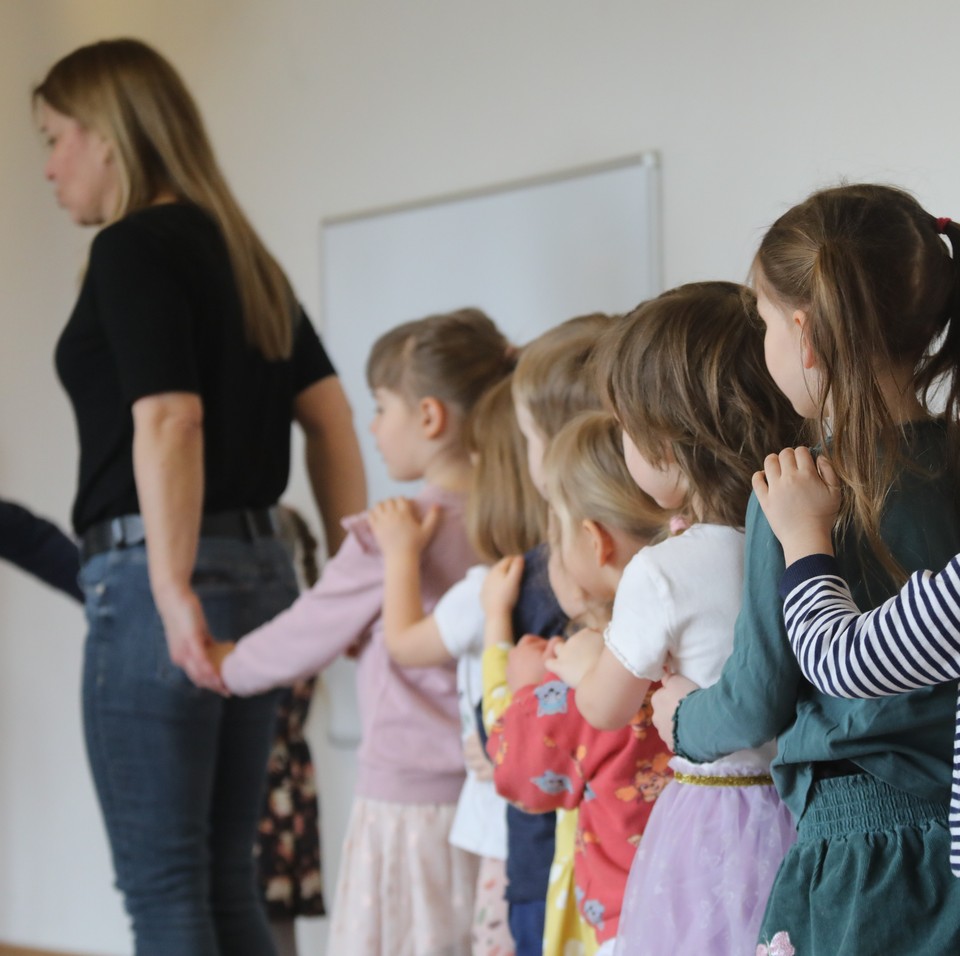 Grupa małych dzieci stoi jedno za drugim w szeregu, trzymając ręce na ramionach osoby przed sobą. Na czele stoi dorosła kobieta prowadząca je dalej. Wszyscy są w jasnym pomieszczeniu, tworząc linię jak w zabawie lub ćwiczeniu.