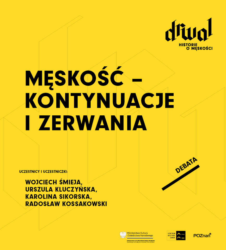 Żółta grafika promująca debatę z cyklu Drwal. Historie o męskości. Duży czarny napis: ‘Męskość – kontynuacje i zerwania’. Niżej lista uczestników: Wojciech Śmieja, Urszula Kluczyńska, Karolina Sikorska, Radosław Kossakowski. Po prawej stronie ukośny napis ‘Debata’. Na dole logotypy organizatorów.