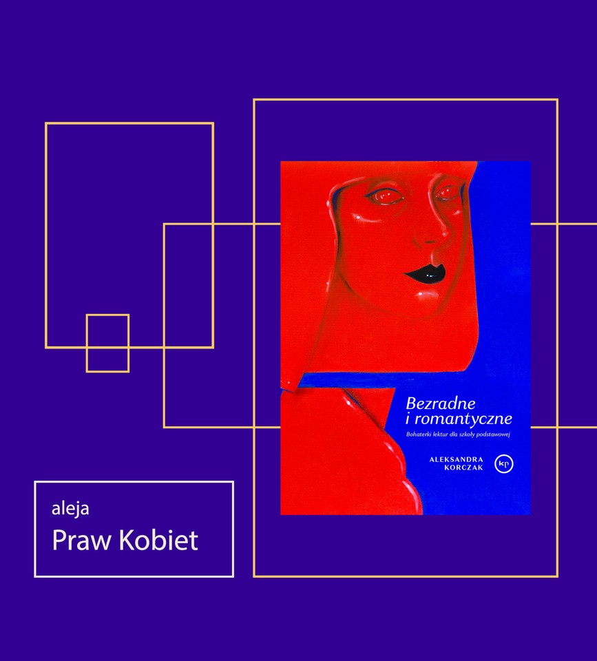 Na granatowym tle widoczne są obrysy prostokątów w kolorze beżowym. Po prawej stronie grafiki okładka książki „Bezradne i romantyczne. Bohaterki kanonu lektur dla szkoły podstawowej” Aleksandry Korczak. Okładka ma intensywne kolory: kobaltowe tło i mocno czerwoną postać kobiety. Kobieta ma czarne usta.