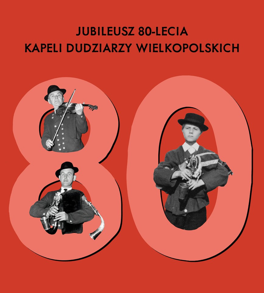 Grafika jubileuszowa z napisem „Jubileusz 80-lecia Kapeli Dudziarzy Wielkopolskich”. Na czerwonym tle widoczna jest duża liczba „80”, w którą wkomponowano archiwalne czarno-białe fotografie muzyków: skrzypka oraz dudziarzy grających na dudach wielkopolskich.