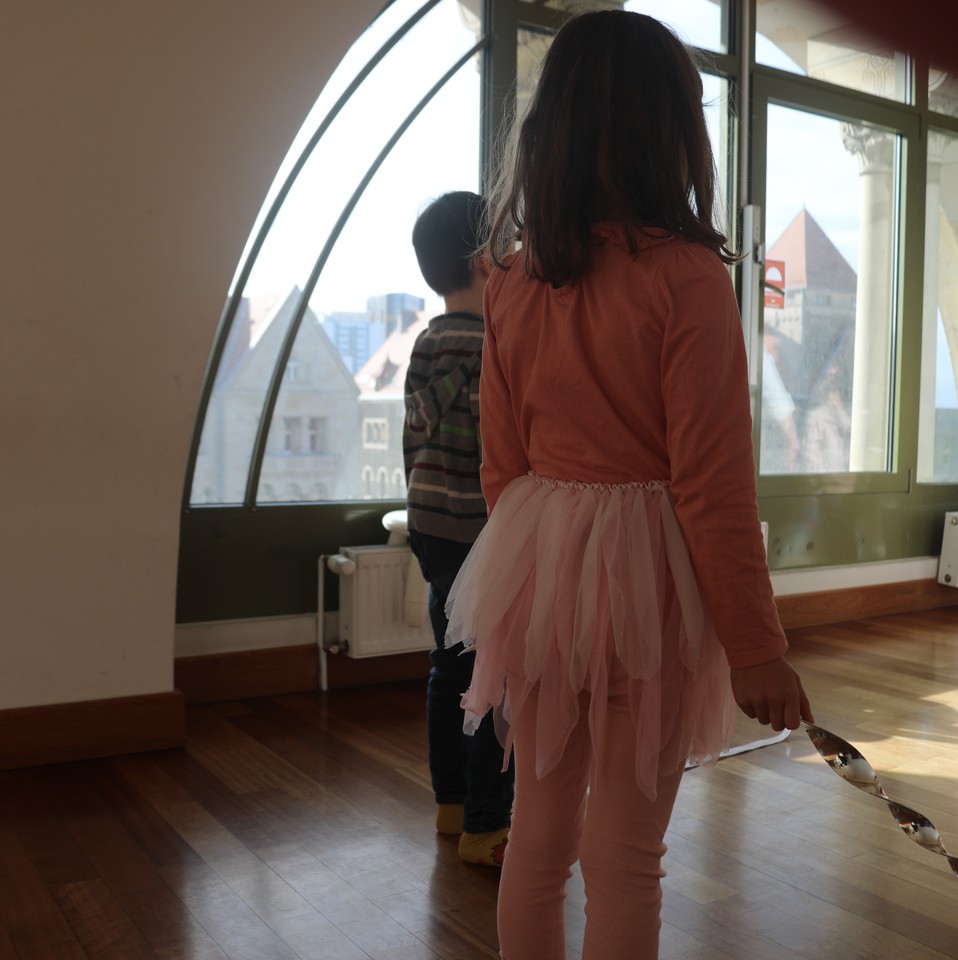 Dwoje małych dzieci stoi w jasnym pomieszczeniu przy dużym, łukowatym oknie. Dziewczynka w różowej bluzce i tiulowej spódnicy oraz chłopiec w swetrze patrzą na miasto za oknem.