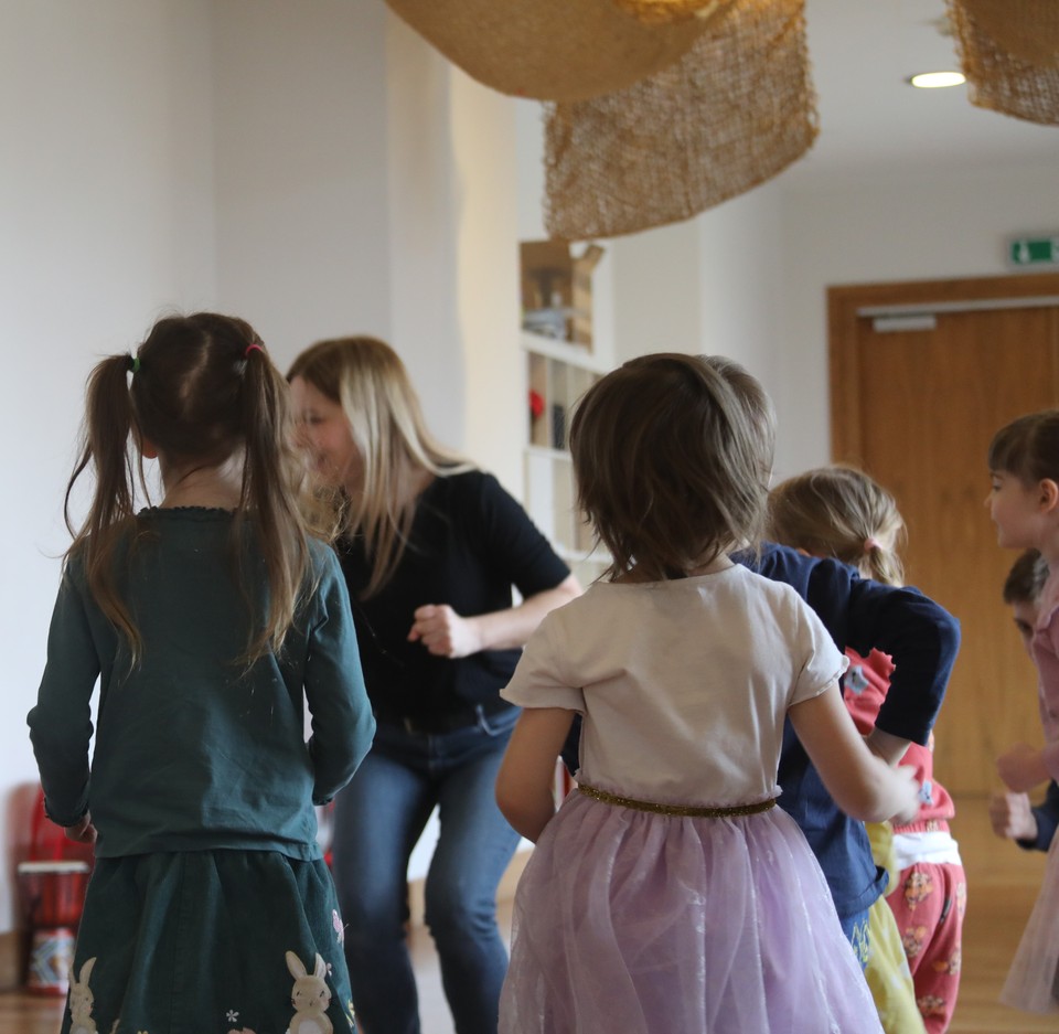Grupa dzieci razem z prowadzącą tańczą w jasnej sali.