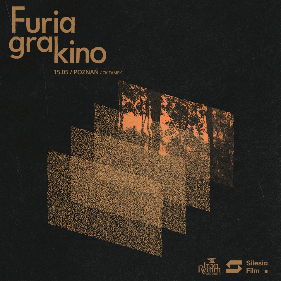 Ciemny plakat z napisem „Furia gra kino” oraz informacją „15.05 / Poznań / CK Zamek”. Na środku znajduje się warstwowa, ziarnista grafika w odcieniach brązu przedstawiająca fragment leśnego krajobrazu. W prawym dolnym rogu widoczne są logotypy Iron Realm Productions i Silesia Film.