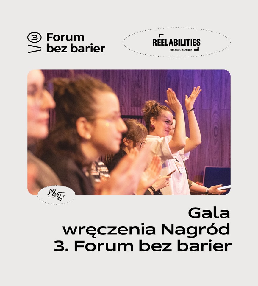 barier oraz dopisek: ReelAbilities. Reframing Disability. Poniżej tytuł wydarzenia: Gala wręczenia nagród 3. Forum bez barier.