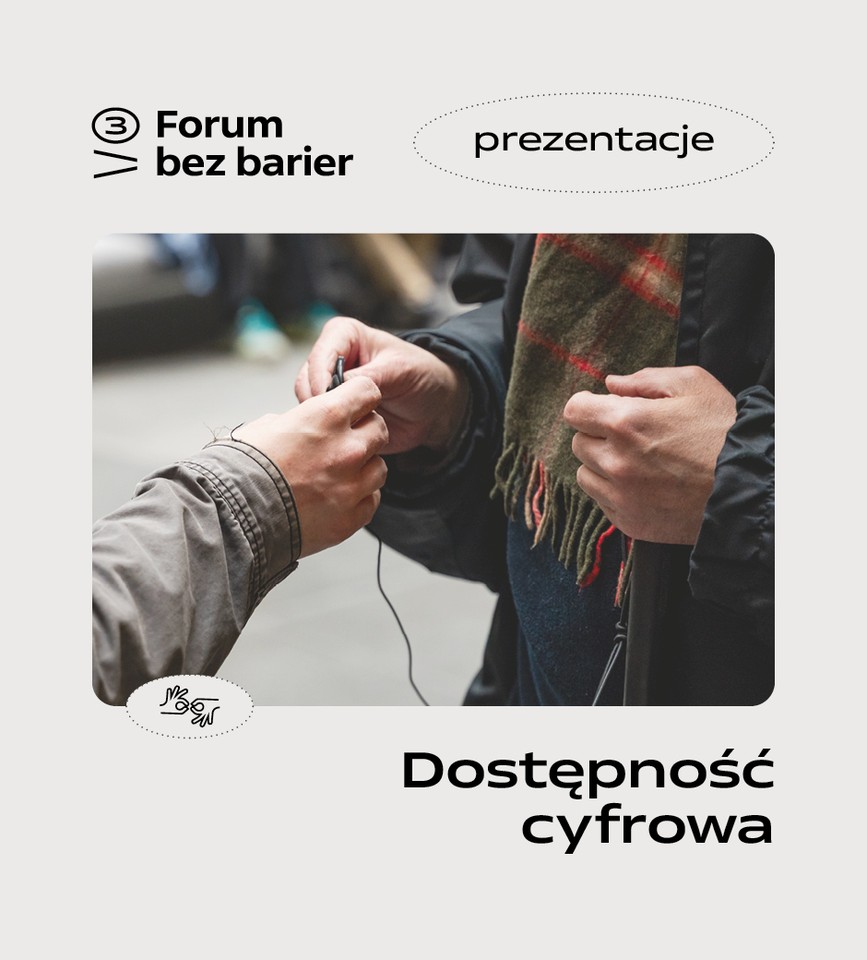 Grafika. Na szarym tle, w samym centrum zdjęcie, na którym widać dwie pary dłoni. To moment przekazania słuchawek do pętli indukcyjnej. Nad zdjęciem logo Forum bez barier oraz dopisek: Prezentacje. Poniżej tytuł wydarzenia: Dostępność cyfrowa.