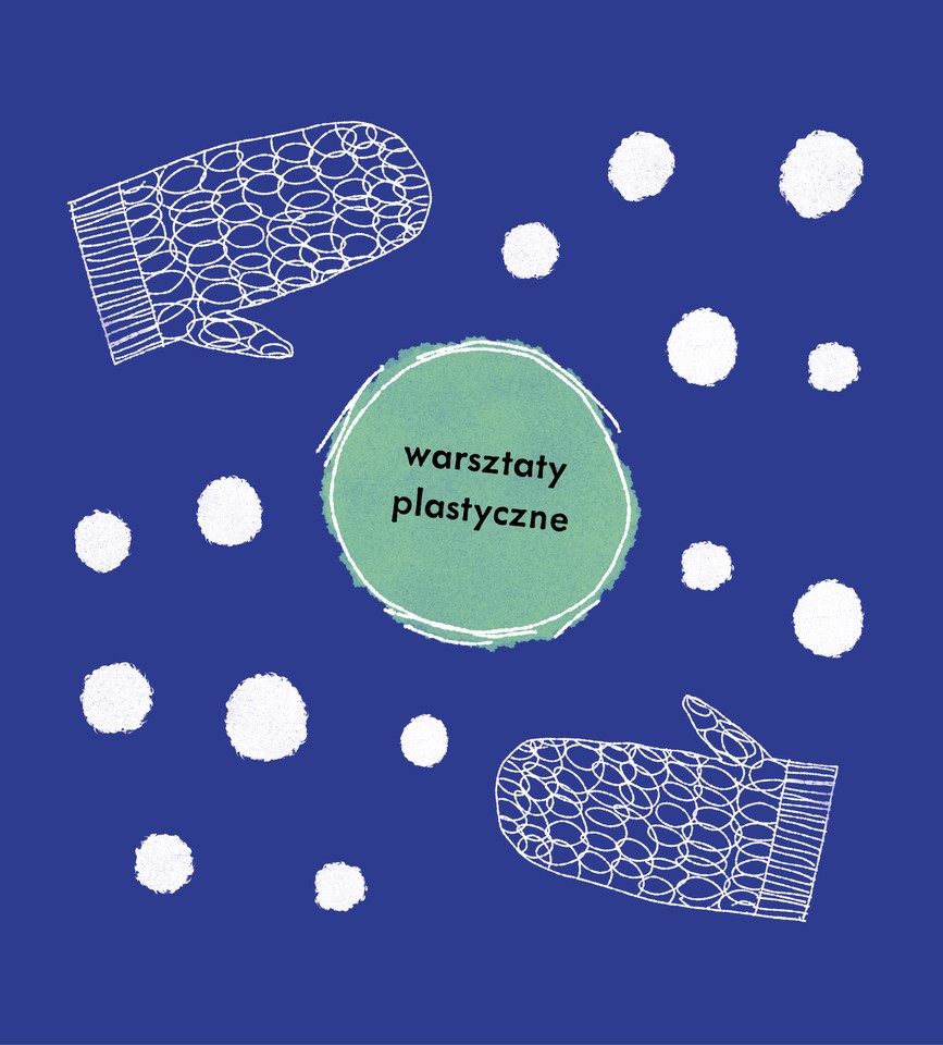 Grafika na granatowym tle. W centralnej części znajduje się nieregularny okrąg z napisem „warsztaty plastyczne”. Wokół rozmieszczone są małe, białe okręgi przypominające śnieżne kulki. W lewym górnym rogu oraz w prawym dolnym rogu znajdują się graficznie przedstawione, jednopalczaste rękawiczki.