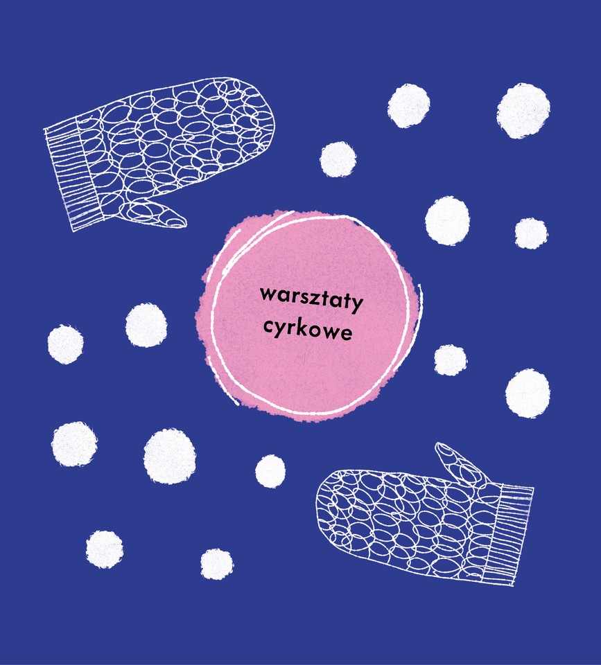Grafika na granatowym tle. W centralnej części znajduje się nieregularny okrąg z napisem „warsztaty cyrkowe”. Wokół rozmieszczone są małe, białe okręgi przypominające śnieżne kulki. W lewym górnym rogu oraz w prawym dolnym rogu znajdują się graficznie przedstawione, jednopalczaste rękawiczki.