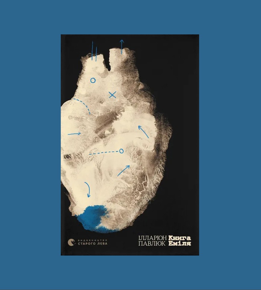 Na niebieskim tle widoczna jest okładka książki Iłłariona Pawluka „Księga Emila”. Na jej czarnym tle beżowy kształt przypominający rzut mapy satelitarnej. Na nim niebieskie strzałki, krzyżyki i koła.