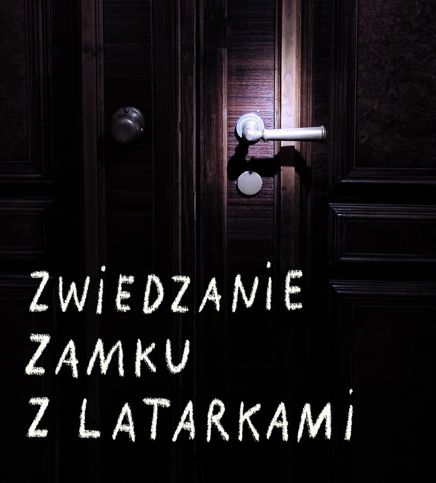 Zdjęcie drzwi, na którym światło latarki pada na klamkę. Na dole napisano odręcznym pismem: Zwiedzanie Zamku z latarkami.