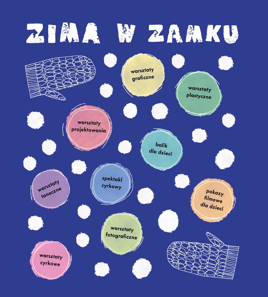 Grafika na granatowym tle z nagłówkiem „Zima w Zamku”. Wśród białych kropek przypominających śnieg rozmieszczone są kolorowe okręgi z nazwami wydarzeń dla dzieci, m.in. warsztaty plastyczne, graficzne, fotograficzne, taneczne i cyrkowe, bal dla dzieci, spektakl cyrkowy oraz pokazy filmowe. Całość uzupełniają ilustracje jednopalczastych rękawiczek.