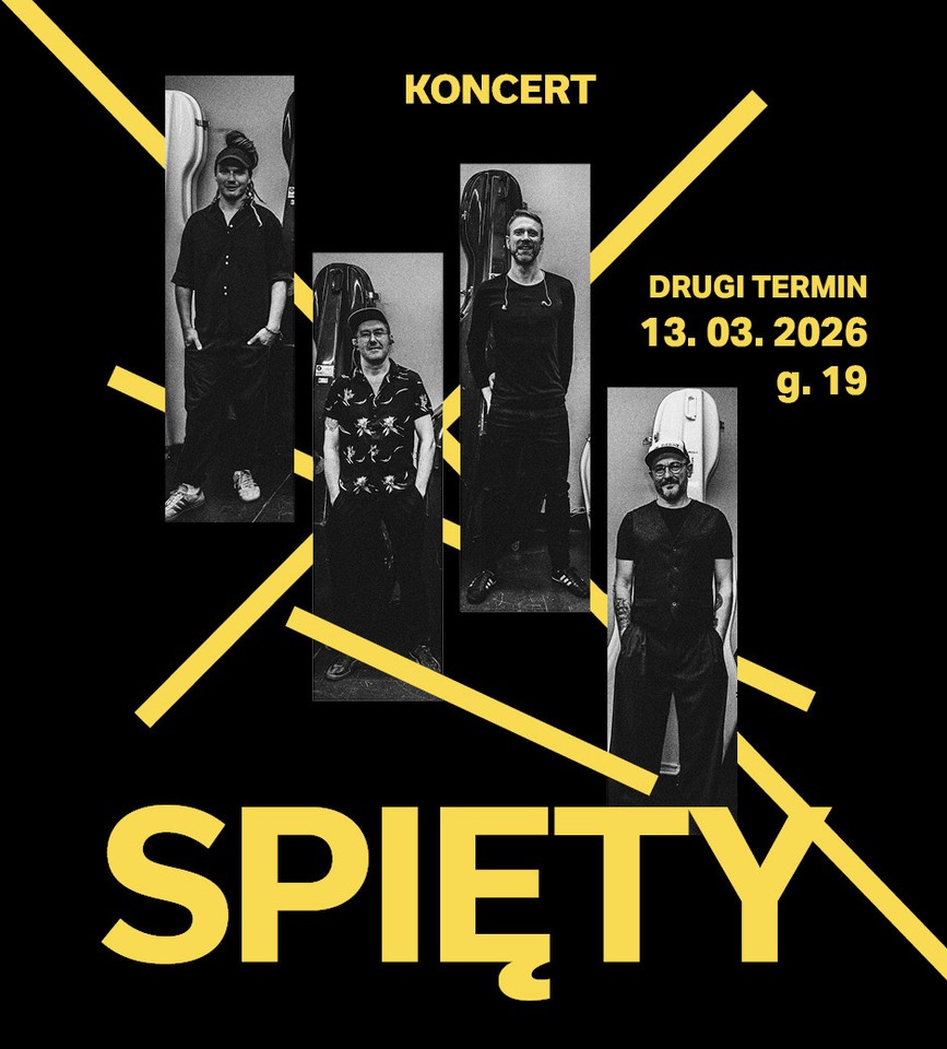 „Plakat koncertu utrzymany w czarno-żółtej kolorystyce. Na czarnym tle znajdują się cztery wąskie, pionowe fotografie czterech mężczyzn stojących osobno, ujętych w odcieniach szarości. Przez kompozycję przechodzą żółte, ukośne linie. Na górze widnieje napis „KONCERT”. Po prawej stronie podano informację: „drugi termin: 13.03.2026 g. 19”. Na dole dużym żółtym fontem umieszczono nazwę „SPIĘTY”.