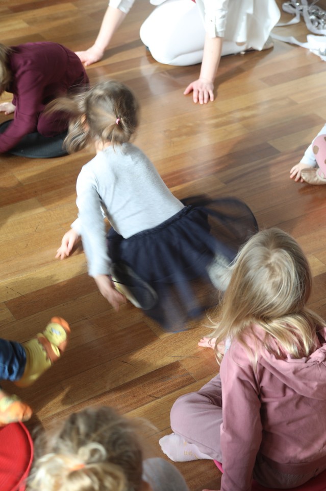 Dzieci w ruchu na drewnianej podłodze podczas zajęć ruchowych; uczestnicy siedzą i poruszają się w kręgu, w tle osoba prowadząca.