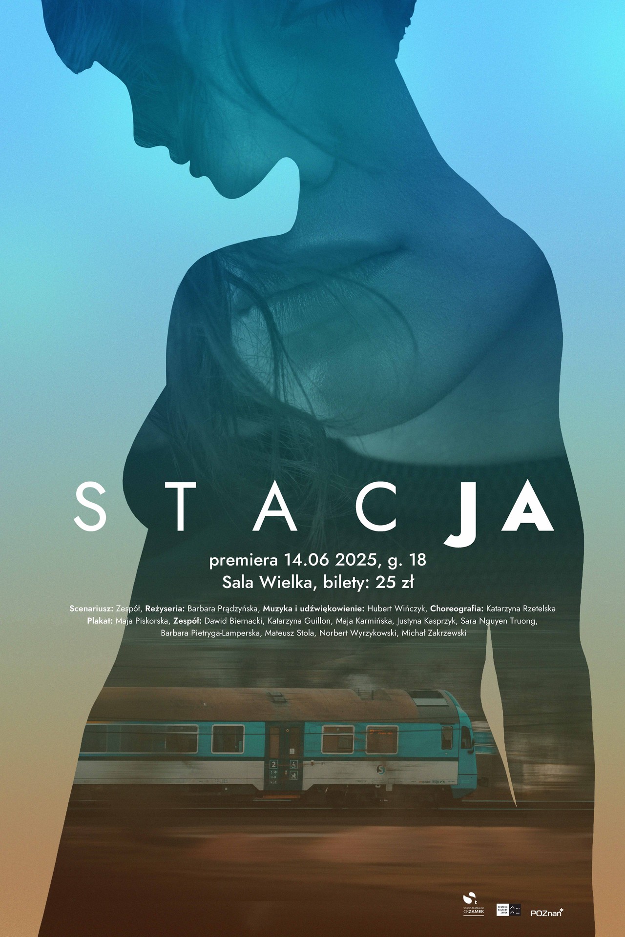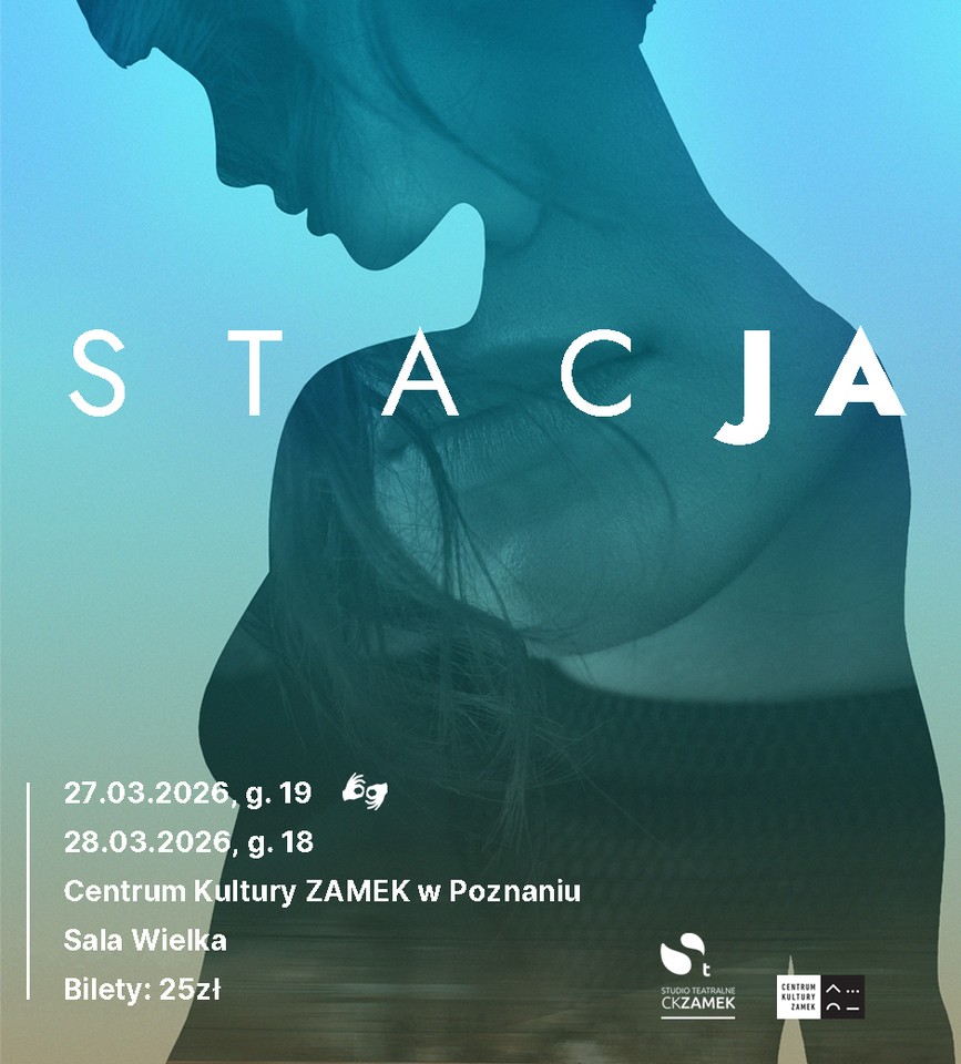 Grafika spektaklu „STACJA” w chłodnej, niebieskiej tonacji z fragmentem sylwetki człowieka w półzbliżeniu. Informacje: 27.03.2026, godz. 19 oraz 28.03.2026, godz. 18, Centrum Kultury ZAMEK w Poznaniu, Sala Wielka.