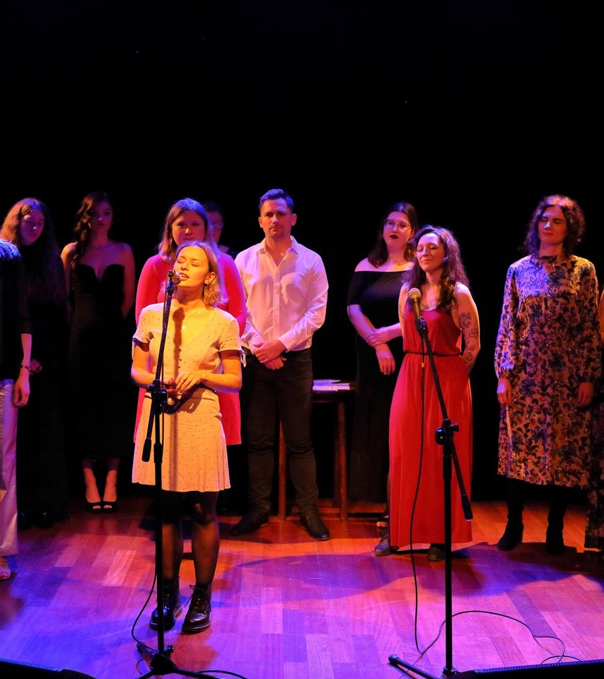 Grupa osób stoi na scenie w półmroku. Z przodu dwie osoby przy mikrofonach, jedna w jasnej sukience, druga w czerwonej – śpiewają lub recytują. Pozostali stoją za nimi w rzędzie. Ciepłe, punktowe oświetlenie na tle ciemnej sceny.
