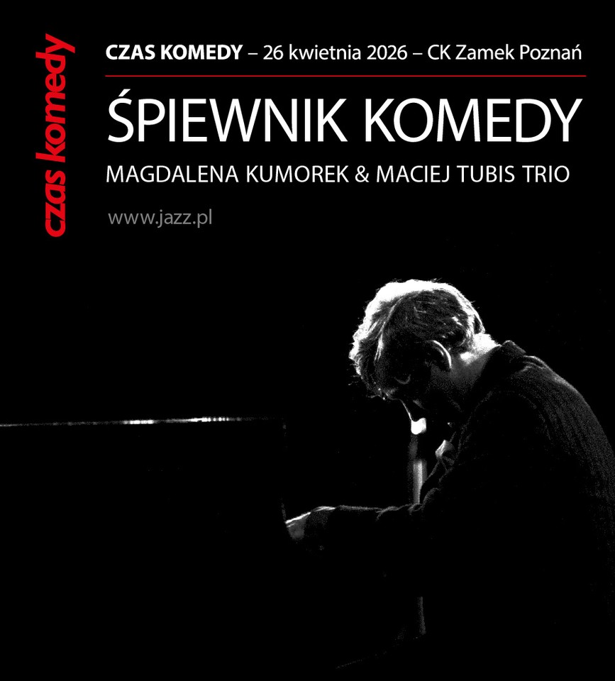 Plakat wydarzenia „Śpiewnik Komedy” w ramach Czas Komedy. Na czarnym tle widnieje biały napis: „CZAS KOMEDY – 26 kwietnia 2026 – CK Zamek Poznań” oraz duży tytuł „ŚPIEWNIK KOMEDY”. Poniżej: „Magdalena Kumorek & Maciej Tubis Trio” oraz adres www.jazz.pl. Po prawej stronie czarno-białe, nastrojowe zdjęcie pianisty pochylonego nad fortepianem, oświetlonego punktowym światłem. Po lewej pionowy, czerwony napis „czas komedy”.