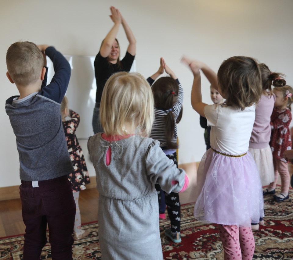 Grupa małych dzieci stoi w sali i wykonuje ruchy z uniesionymi rękami, naśladując prowadzącą stojącą przed nimi. Zajęcia odbywają się w jasnym pomieszczeniu z drewnianą podłogą i dywanem.