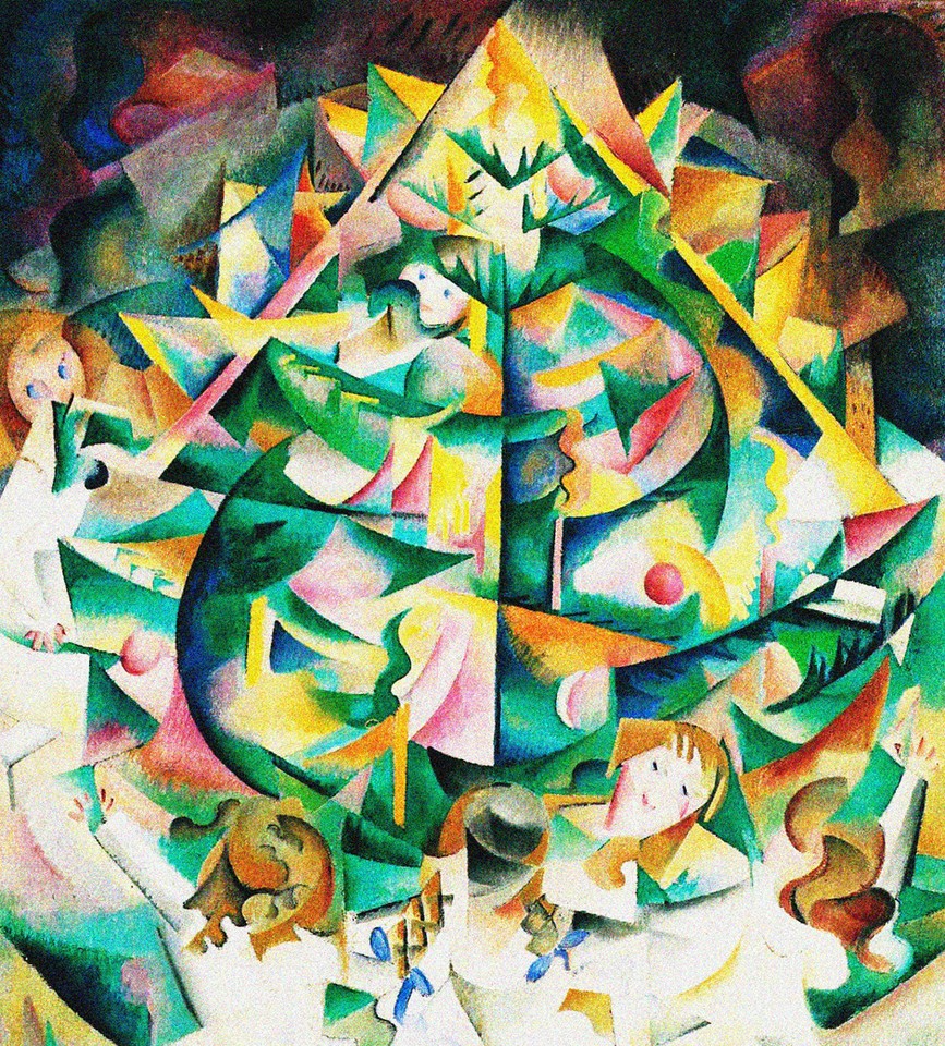 Abstrakcyjny, kolorowy obraz w stylu kubistycznym przedstawiający wiele uproszczonych postaci ludzkich i zwierzęcych, złożonych z geometrycznych kształtów (trójkątów, łuków i wielokątów). Dominują żywe barwy – zielenie, żółcie, błękity i róże – tworzące dynamiczną, niemal wirującą kompozycję. Wśród form można dostrzec fragmenty twarzy, sylwetki oraz elementy przypominające rośliny i przedmioty, które nakładają się na siebie i przenikają, budując wrażenie ruchu i wielowarstwowości.
