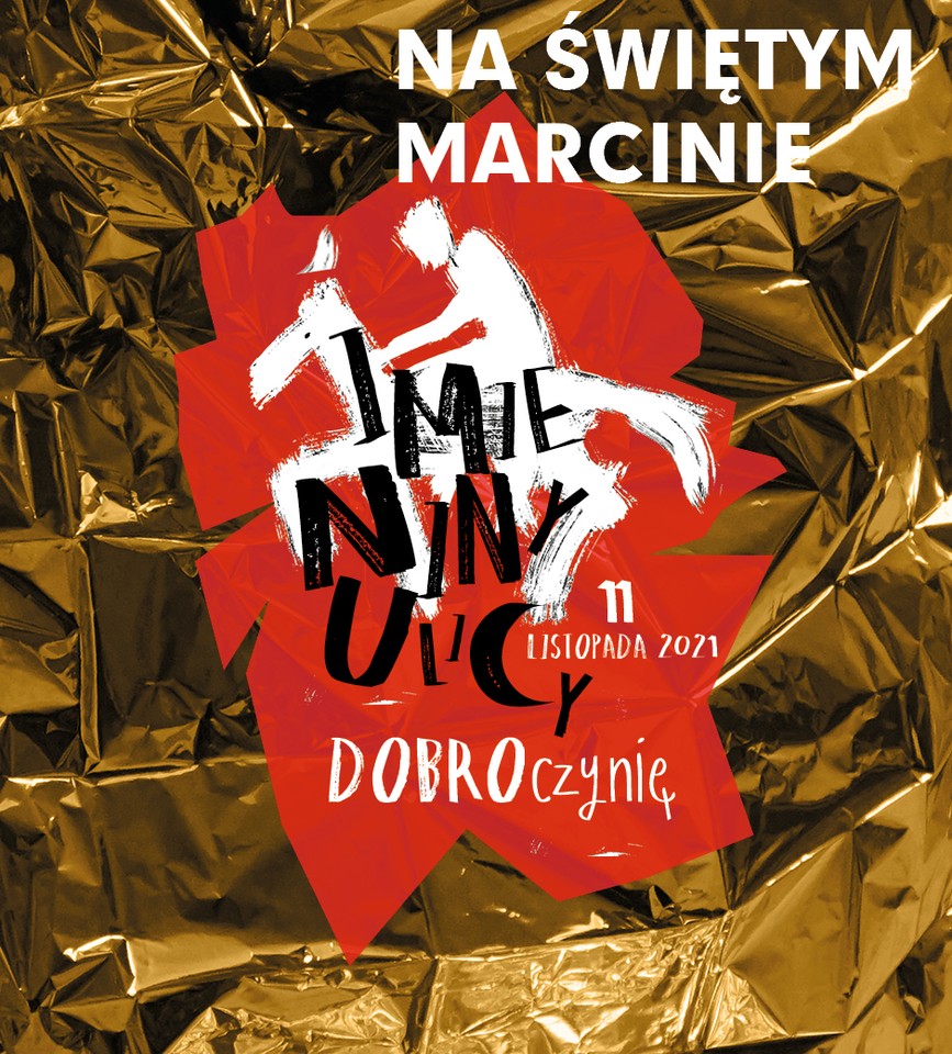 Grafika towarzysząca tegorocznej edycji Imienin Ulicy Święty Marcin w Poznaniu. Pośrodku biała postać jadąca na koniu, namalowana kilkoma maźnięciami grubego pędzla. Na niej czarny napis „Imieniny Ulicy”, obok biały – „11 listopada 2021”. Poniżej hasło tegorocznej edycji wydarzenia – „DOBROczynię”. Postać i napisy umieszczono na czerwonym kształcie przypominającym ponacinany na brzegach papier. Tło grafiki stanowi natomiast złota, błyszcząca, pognieciona folia. W lewym górnym rogu umieszczono napis: NA ŚWIĘTYM MARCINIE.