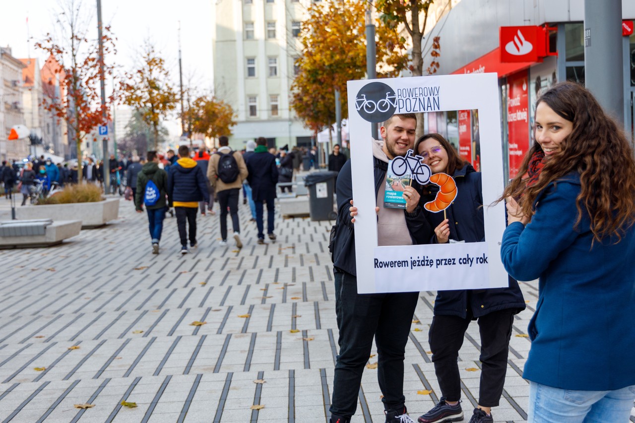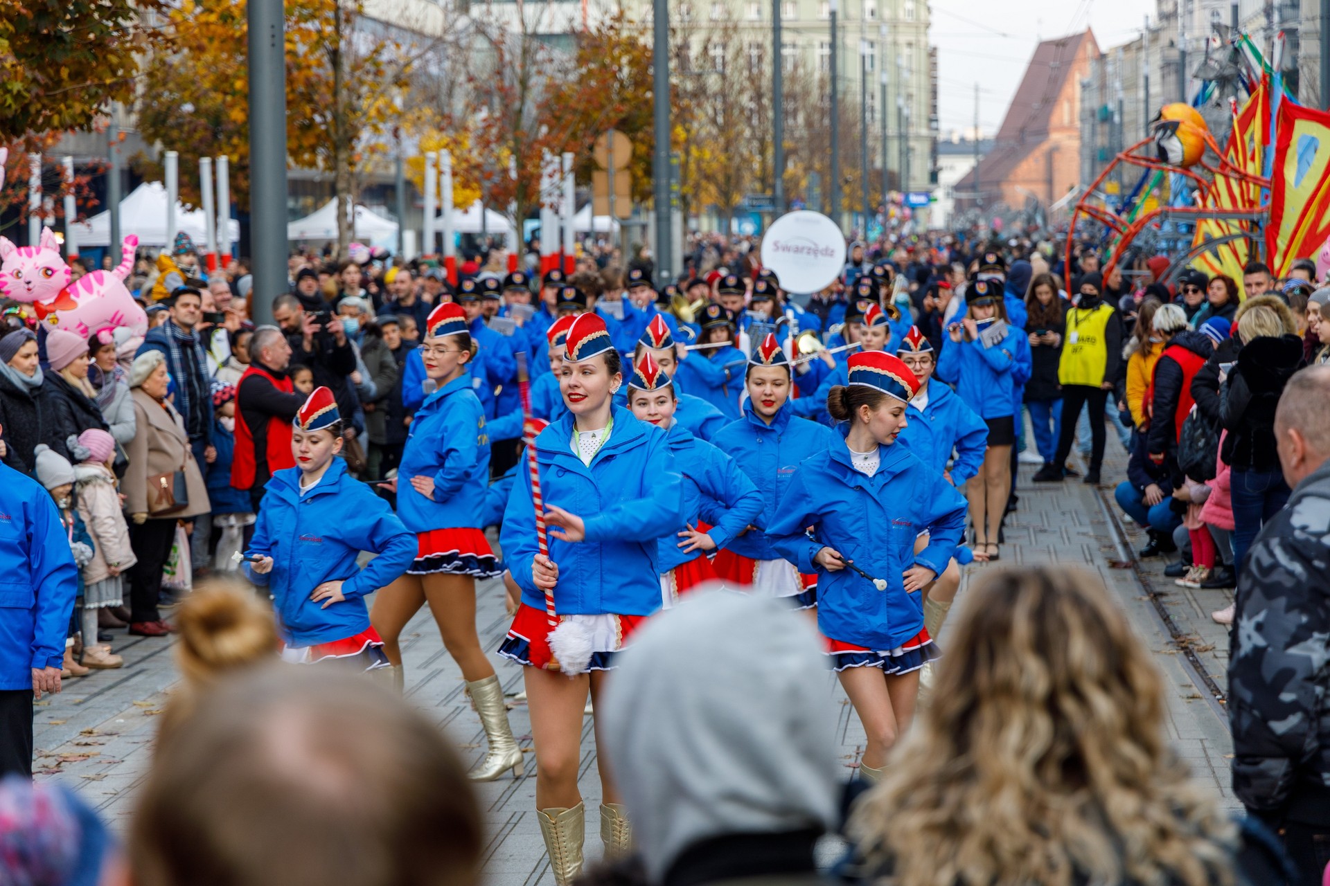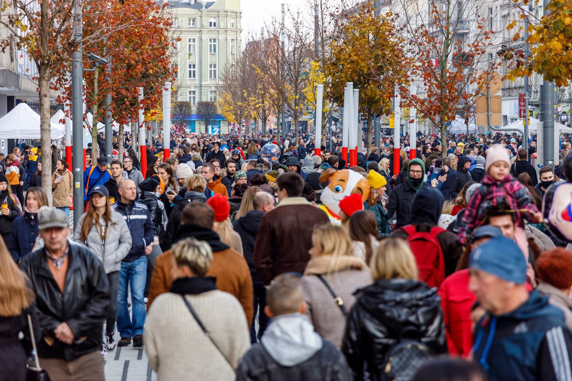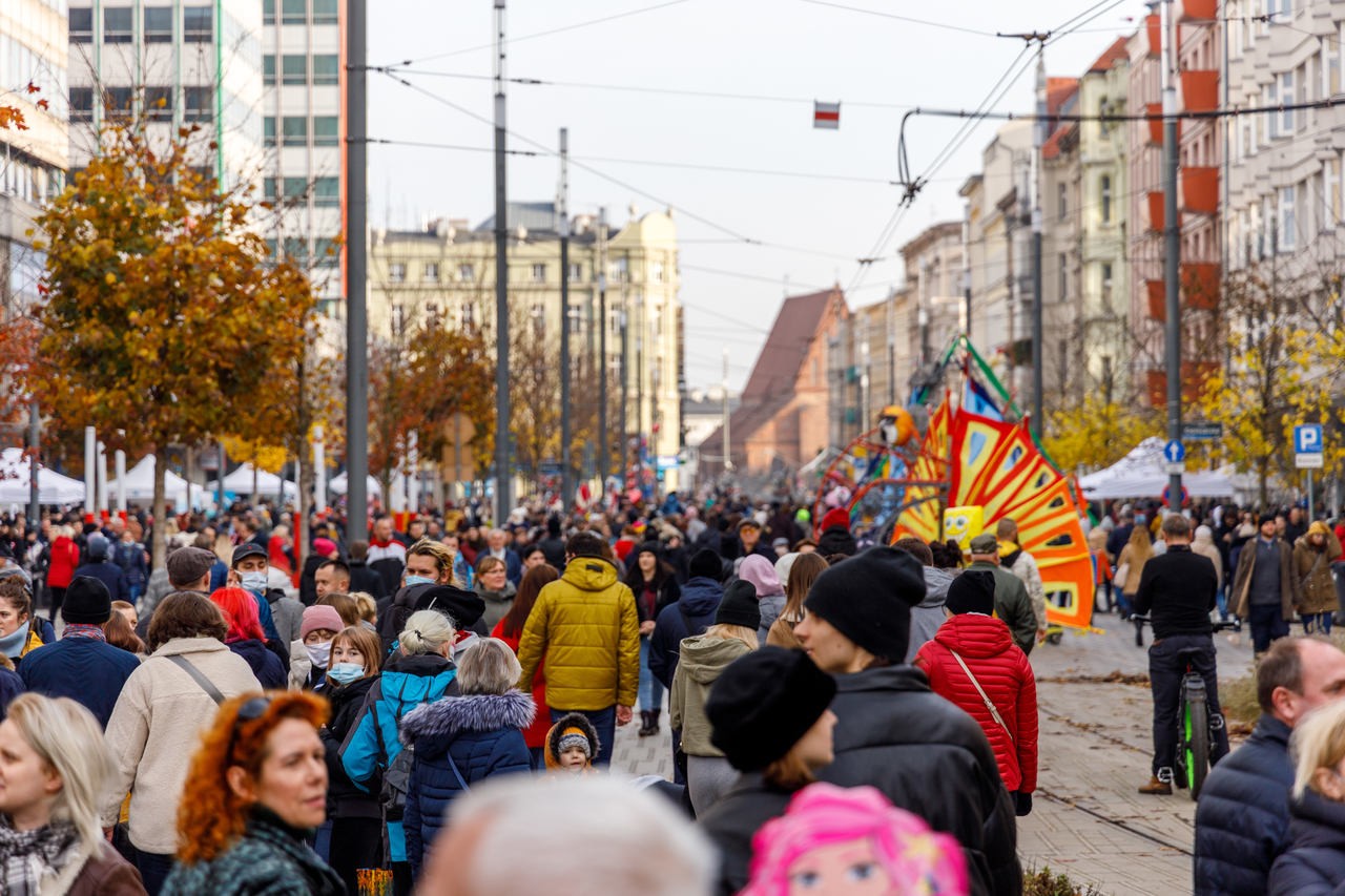 Fot. M. Kaczyński. Na fotografii tłum ludzi przechadzający się ulicą Święty Marcin. W tle wielokolorowe elementy Korowodu Św. Marcina i poznańskie kamienice. Zdjęcie zostało wykonane podczas tegorocznych obchodów Imienin Ulicy Święty Marcin w słoneczny, jesienny dzień.